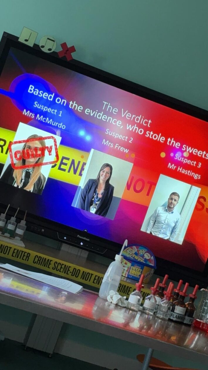 We are so lucky to have built up an amazing partnership with Ayrshire College Science Team.Β Our P6 and P7 classes were treated to a morning of being detectives to find out who stole the sweeties!