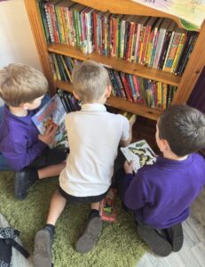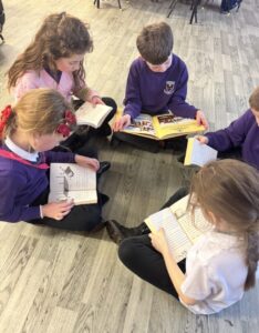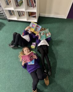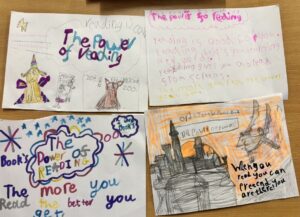 Some photos of P4H reading for enjoyment, including audiobooks, library time and making posters about the power of reading.