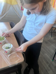 As a class we discussed what the cress would need if it was growing outside and we decided it would need protection from risks such as animals and harsh weather. We first designed different structures that could protect the cress. Then we attended to build some using K-Nex. After further discussion we decided that greenhouses would be the best solution so we designed and build our own greenhouses for the cress.
