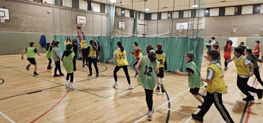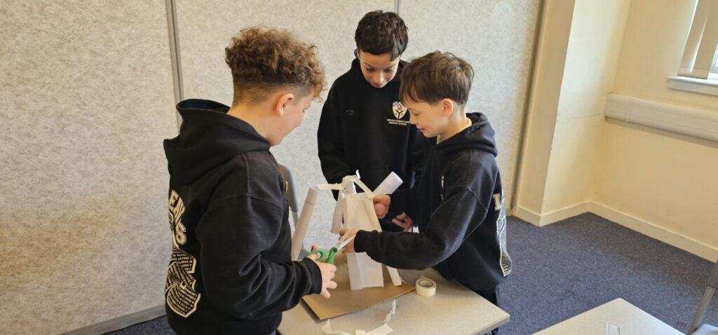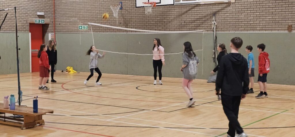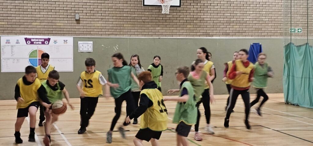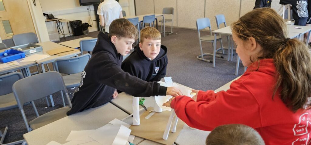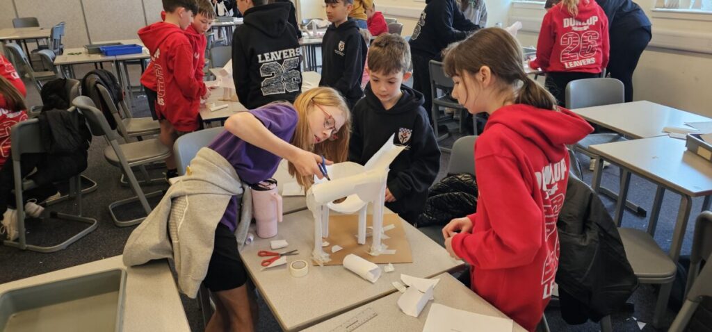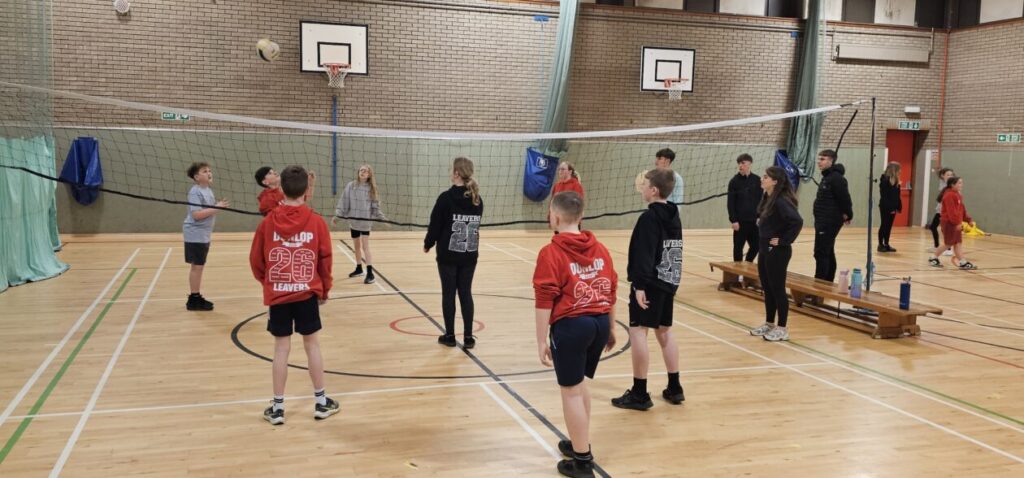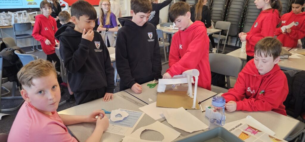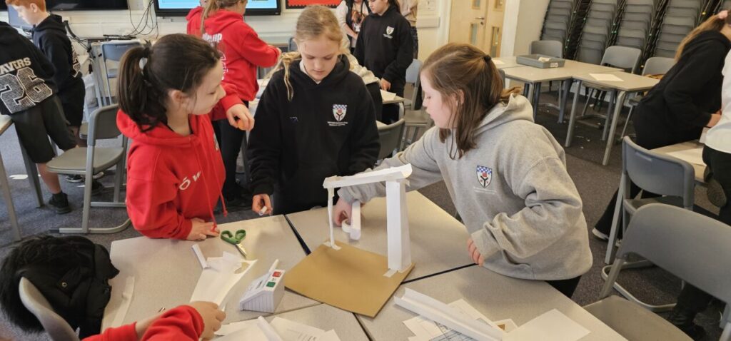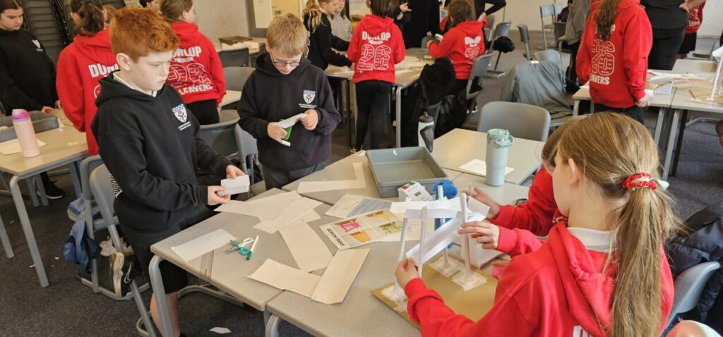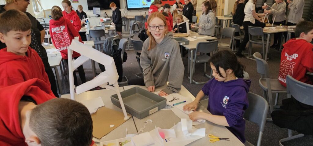 All the NRPS P7s went to Stewarton academy to work with P7s from Dunlop Primary. They were with the PE staff playing basketball and volleyball and with Miss Beattie PT of STEM working on a STEM challenge to see whose ball could stay on the run they created the longest.