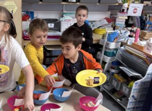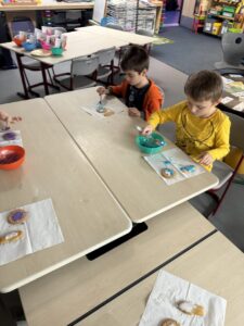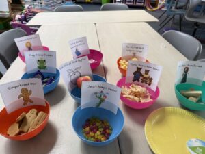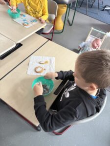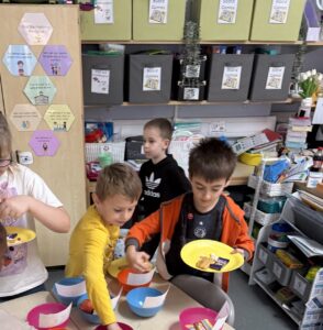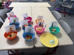 Goldilocks and the Three Bears– So far, we have tried some coloured sematic writing and created beds and chairs for Baby Bear using Lego; we investigated at what happened when we put Gummy Bears in water and the science behind it; we tasted some sweet, salty and plain porridge; and we practiced Kandinsky’s concentric circles to create a patterned porridge bowl.