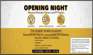 If you would like to reserve a place to attend, please email eaRobertBurns.Ac@eastayrshire.org.uk with Pupil’s Name, Parent/Carer’s Name and Primary School attending.