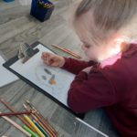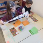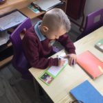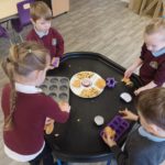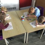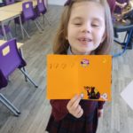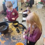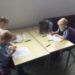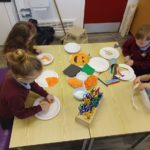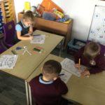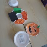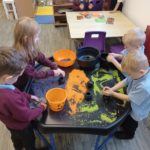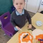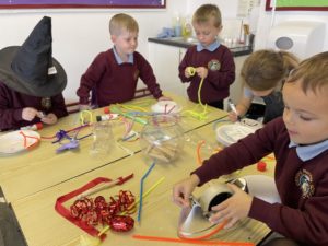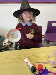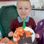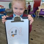 We had some fun Hallowe’en themed activities in class today as Mrs Cook is going to miss all the real Hallowe’en fun on Monday. We had some lovely spooky pasta shapes and playdough, some purple, green and orange rice for making our own potions. At our writing table we had a station for making Hallowe’en cards and at our creation station we were making paper plate pumpkins. We also made spooky castles with the big blocks. Some of the children tried some Art for Kids Hub tutorials on the big board and followed the instructions to make their own fabulous spooky pictures.