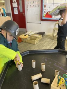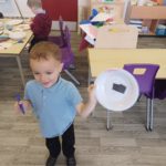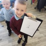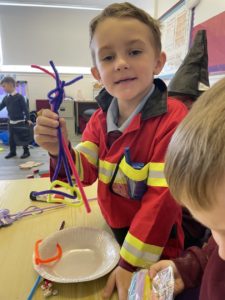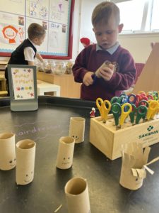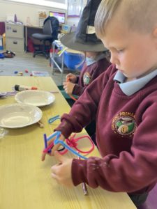 This afternoon we worked on making our fingers strong at the ‘Funky Fingers’ Stations. We used scissors to be hairdressers and give our kitchen roll clients a haircut. We also used pipe cleaners (and our imagination) to create dream catchers, monsters and wands!