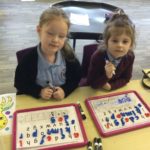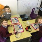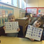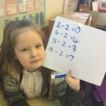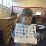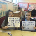 In Numeracy this week we have been working on subtraction. We started by looking at taking away one and realised that this is just “the number before” or “one jump back on the number line”. When we looked at taking away 2 we could see that that was just “two jumps back on the number line”.