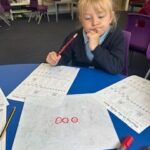 We have also continued to investigate equal sharing. We drew circles and shared out dots to help us share quantities. We also investigated halves. We worked together as a group to make halving shape posters.