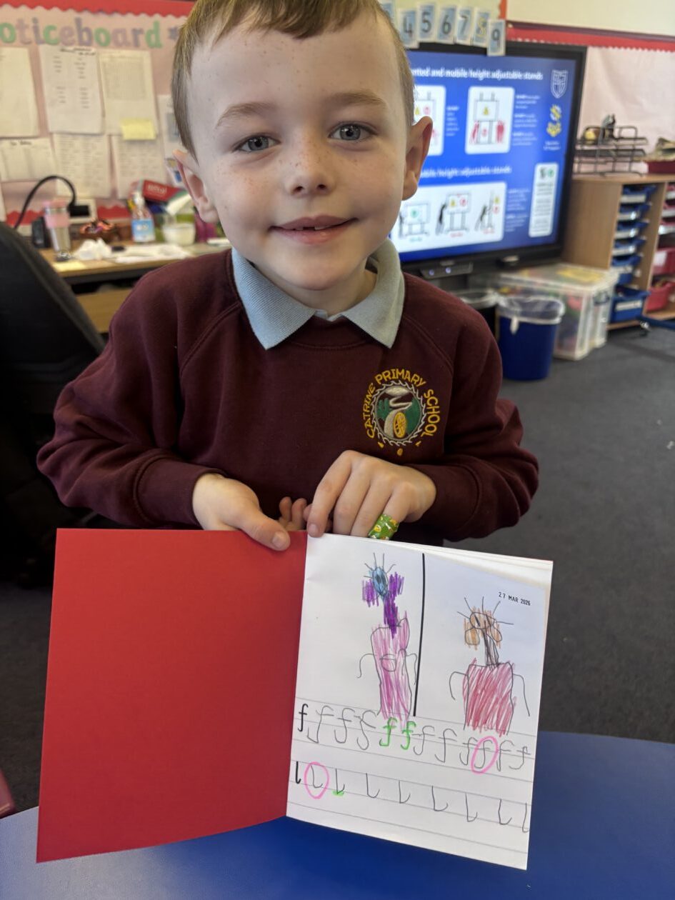 On Thursday and Friday, we worked on some beautiful drawings of flowers in a vase. We used paint sticks in lots of vibrant colours to bring our flowers to life. We then cut these out and stuck them onto a card. If you are a mum of  a Primary 1 who would like a little surprise on Sunday, then look away now!