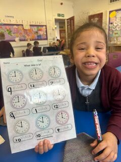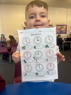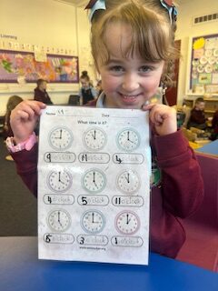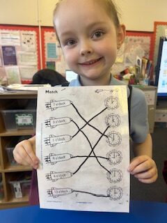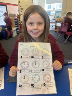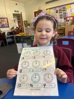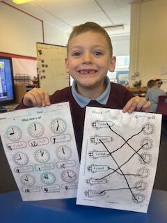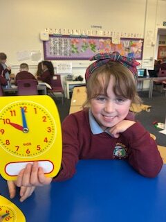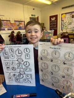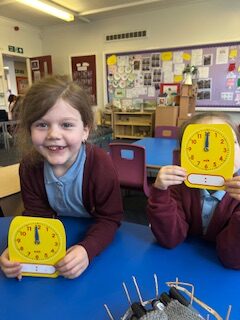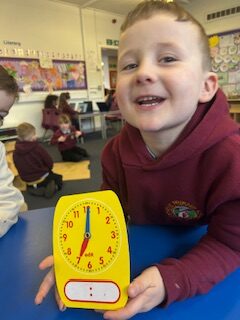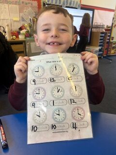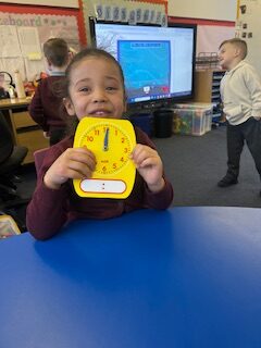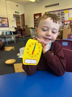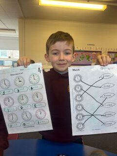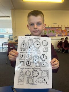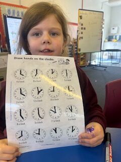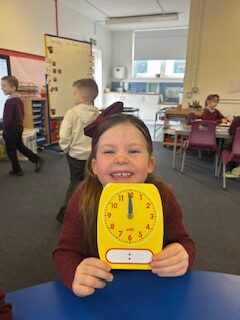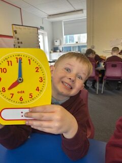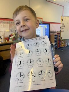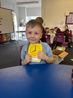 In numeracy we have been learning o’clock times on an analogue clock.