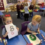 This week we have been working on our formation of 6,7 and 8. We worked hard to form them correctly in our jotters, made some sparkly numbers and  used the bingo dabbers to practise our hand eye coordination and make some lovely 8s.