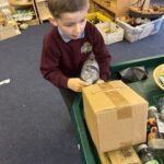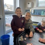 On Friday, we joined up with Primary 2 and had some more Hallowe’en fun! We played games, danced and had a snack in the Primary 2 classroom. In our own classroom we had some spooky sensory activities, like making ‘ice-screeeeam” with foam and creepy crawlies and scented playdoh. We also got a chance to use a hammer and some nails in a pumpkin and worked together to crack them open and see what was inside!