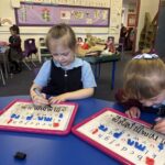In numeracy we’ve continued to focus on numbers 0-10 and 0-20. We’ve looked at recognising numbers, counting and working out the missing numbers. We used the number fans to play ‘show me’ games.