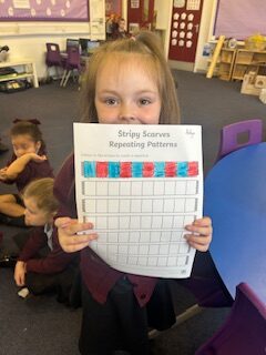 We also continued investigating and creating repeated patterns. We have made patterns with playdoh, peg boards, played Pattern games on the chromebooks, created pattern scarfs and decorated our home corner with lovely patterned wallpaper.