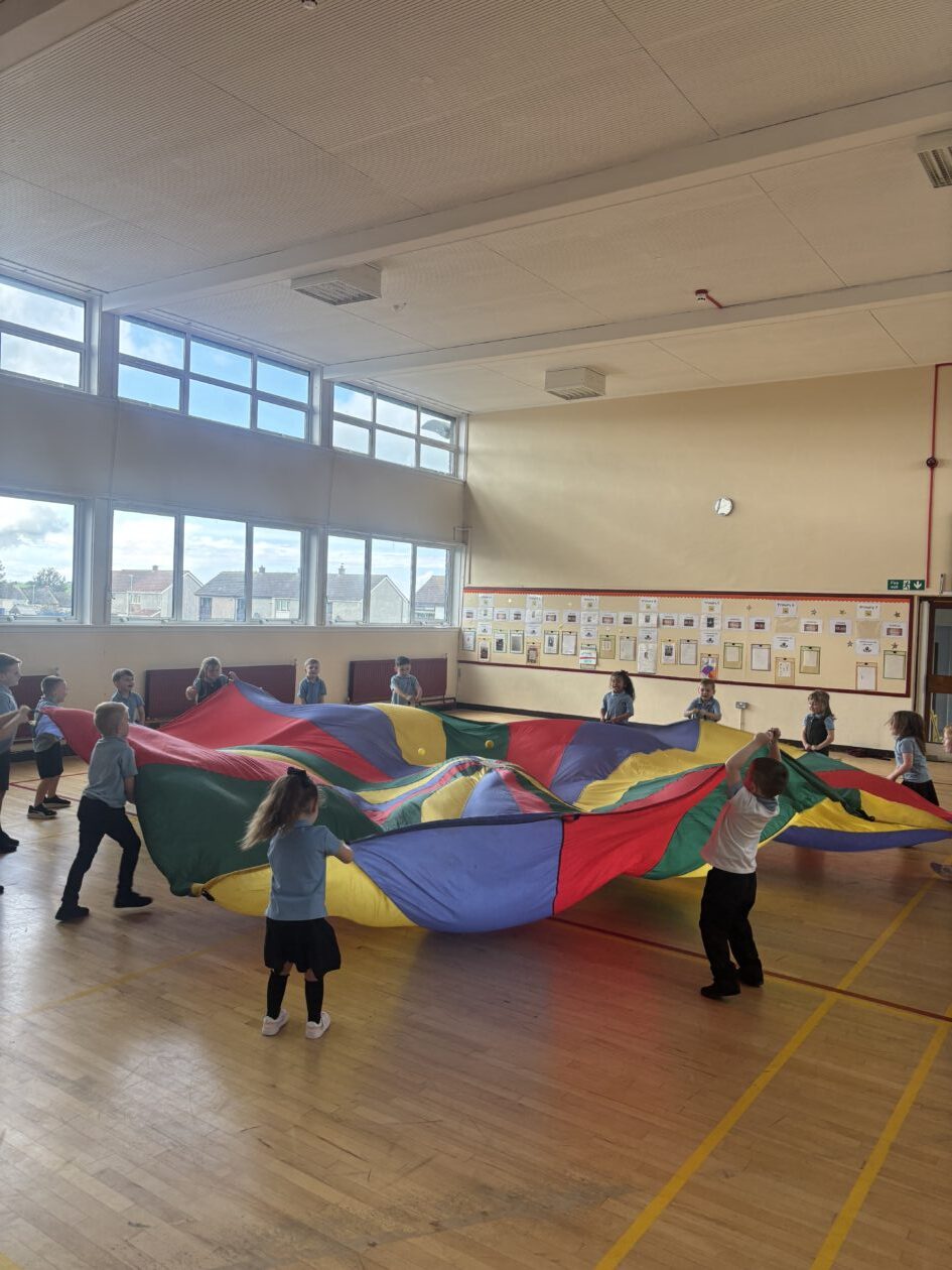 In the gym hall, we practised listening carefully to the rules of games such as ‘cat and mouse’ and ‘washing machine’. We had lots of fun with the parachute!
