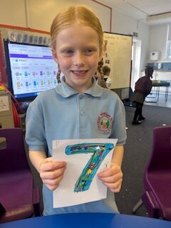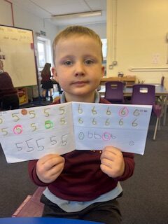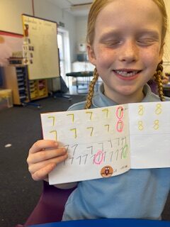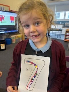 This week we have been working on our formation of 6,7 and 8. We worked hard to form them correctly in our jotters, made some sparkly numbers and used the bingo dabbers to practise our hand eye coordination and make some lovely 8s.