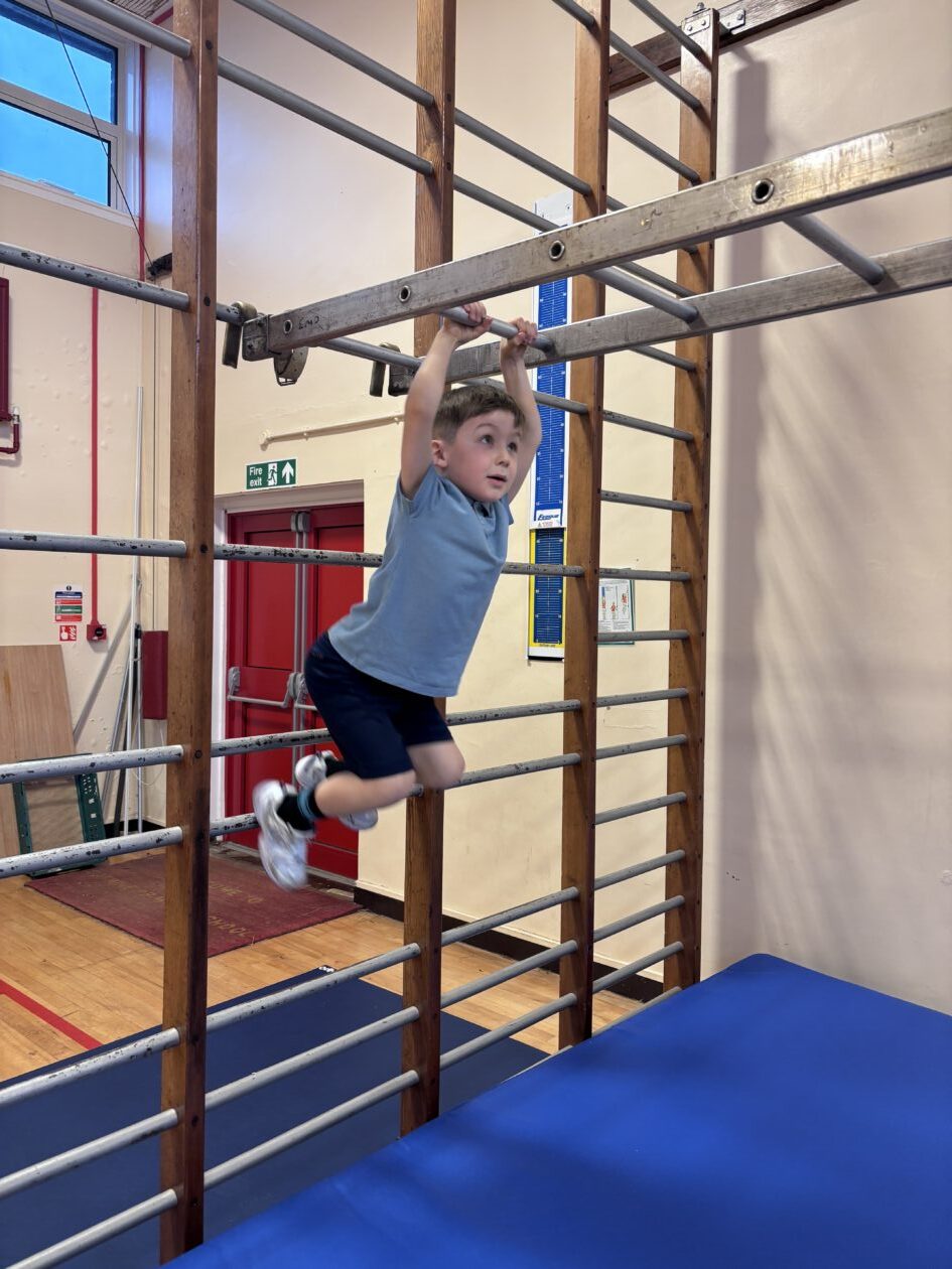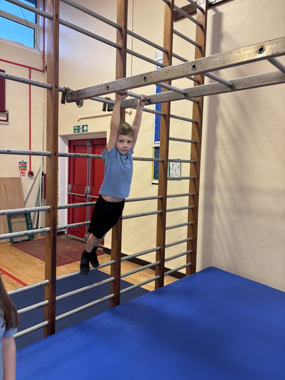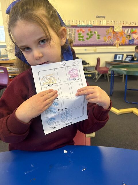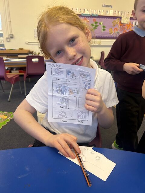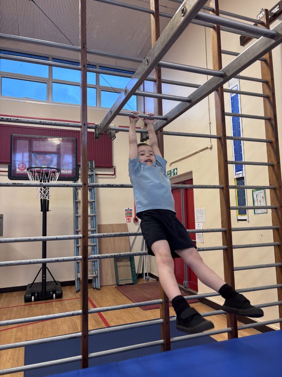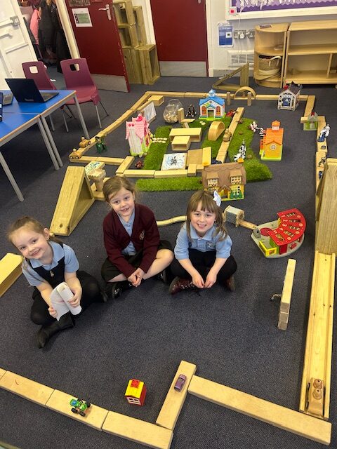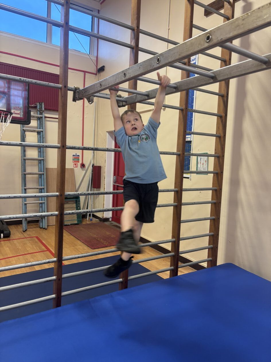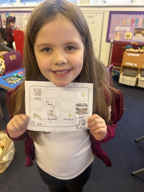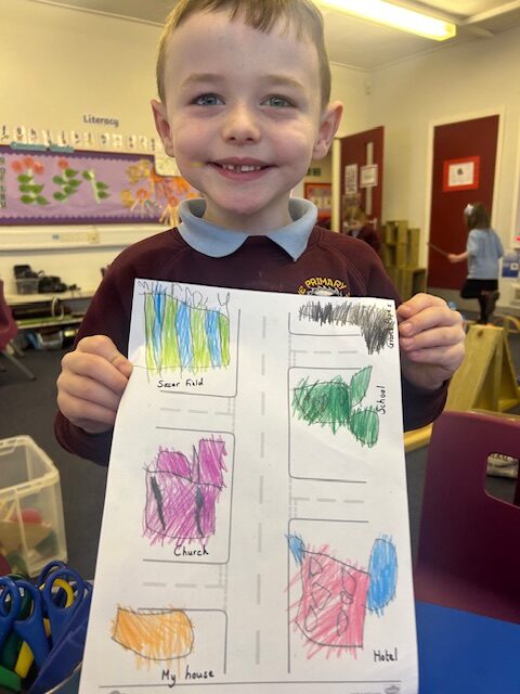 We have also been busy in the gym, continuing our gymnastics block.  We got a chance to use some of our large equipment including the monkey bars and ropes! As part of Scotland topic, we have been making maps. Some of us used the blocks to make a fantastic map of a town!
