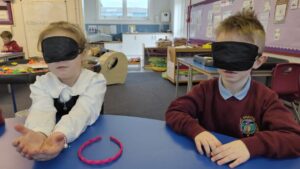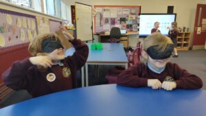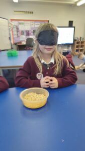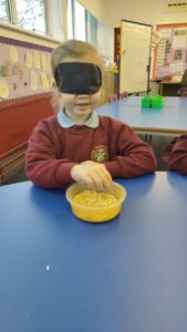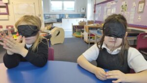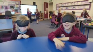 In science P2 have been learning about their senses.  They used blindfolds to find out what it might be like to be blind and then carried out some experiments using their other senses, including touch and smell, to identify mystery items.