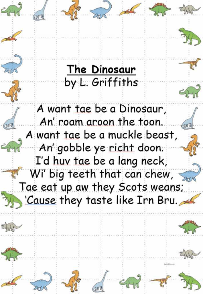 Below is a copy of our Scots poem ‘The Dinosaur. A copy was sent home with each pupil but if you need another just let me know.