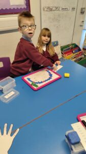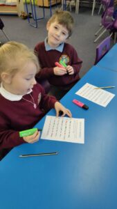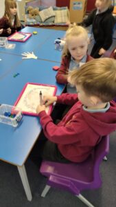 This week P2 have been learning the ‘ow’ phoneme as in cow, owl and tower. They practised their spelling words with a partner using magnetic letters and boards.