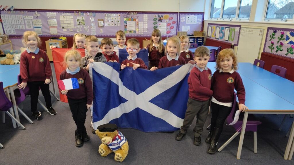 In French, Camembear helped us to learn about the French and Scottish flags. We learned how to say the colours red, white and blue in French.