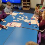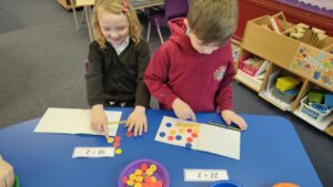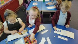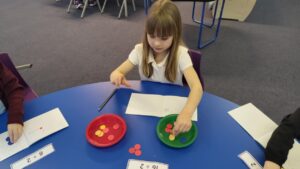 In Numeracy P2 have been learning about division and using the division symbol in calculations. They used counters to help them by sharing them out into equal groups. They also used Pokémon cards to consolidate their learning on addition.
