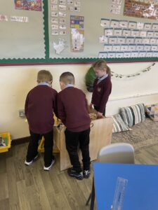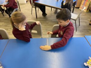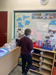 As part of our Farm to Fork topic, we learned about growing food. We discovered plants and trees are very important for our environment so we decided to help our planet by making our own compost. We layered recycled paper, leaves and fruit peeling in a plastic bottle, sprayed it with water and placed it in our warm cupboard. It will take a long time but we are hoping we can use it to plant some seeds in the Spring.