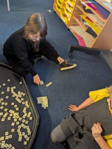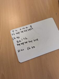 We have been learning to calculate change by using the ‘counting on’ method. Some learners like to do this with a blank number line, a 100 square or simply in their head. It can be quite tricky so pupils may want to practise this a little more. As a rough guide the pyramids were calculating change from £2 and with the challenge of £5; the cubes have been working with change from 50p or £1.
