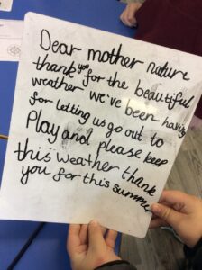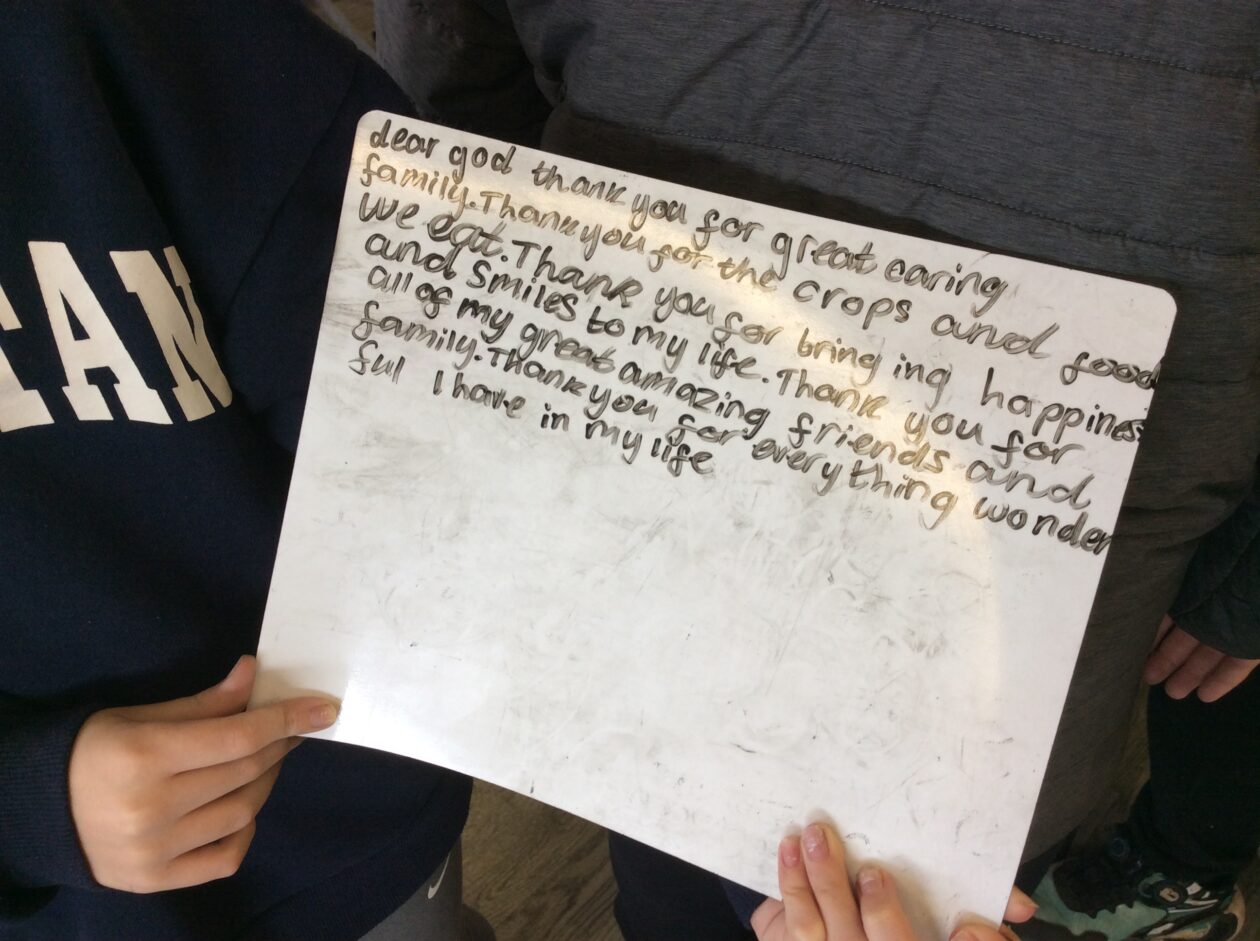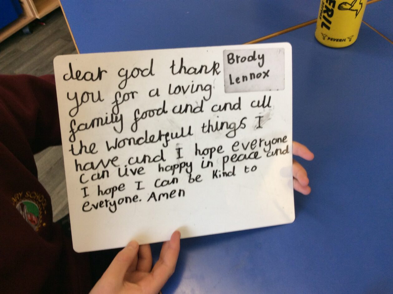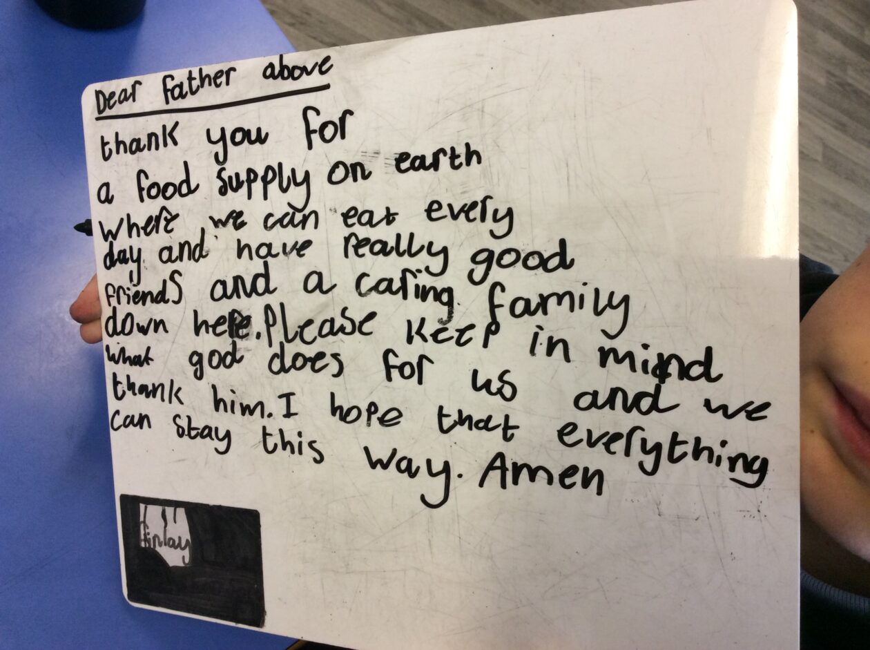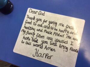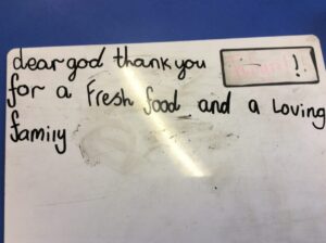 This week we looked at music and prayer as a form of worship. The children listened to different pieces of music from a range of religions and discussed how it made them feel and what they noticed about the music. Today we looked at the reasons people pray in different religions. We noticed themes of “Hope”, “Love” and “Thankfulness” and this helped us to have a go at writing our own prayers. They did not have to be religious and the children chose who they would write the prayers to. I was blown away with the maturity of all the pupils, who really engaged in the lesson and put a lot of thought and effort into coming up with their own versions of a prayer.