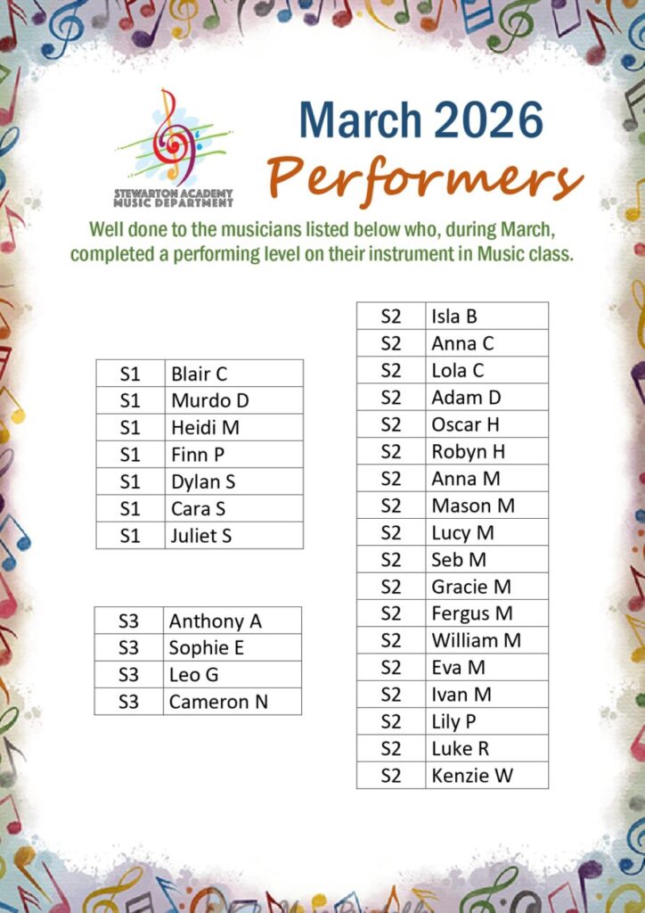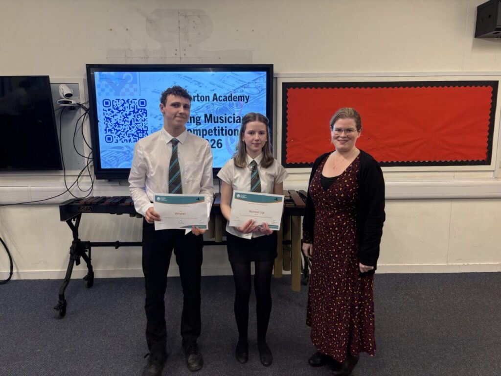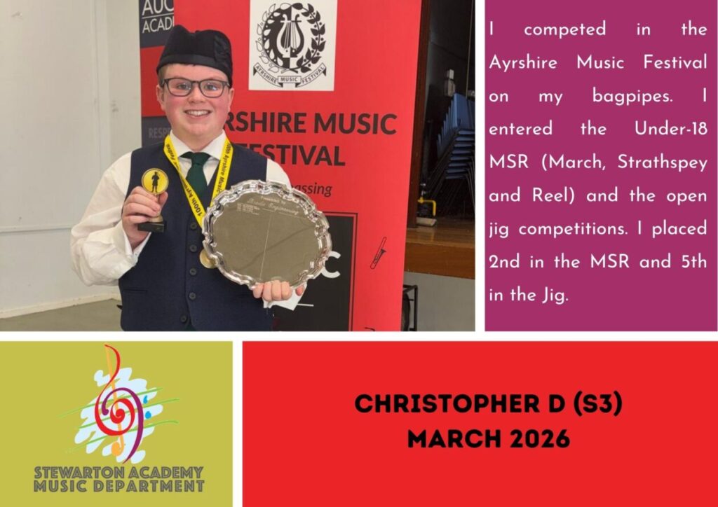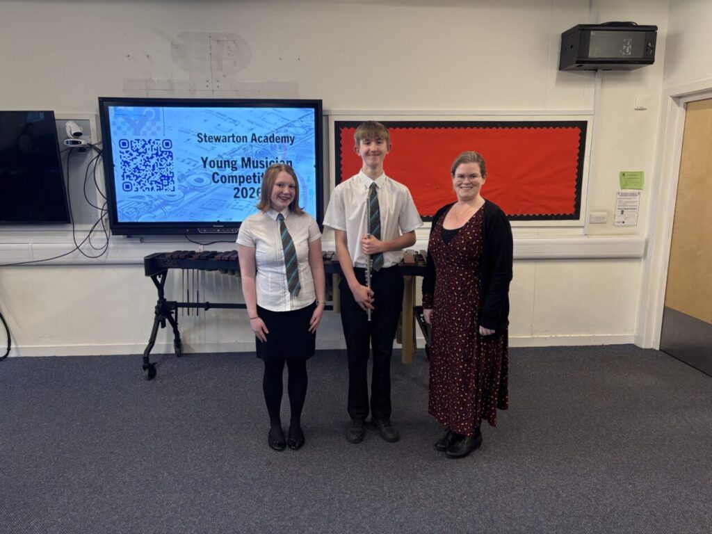 Following their success at our school Young Musician Competition last month, Gregor C (S5) and Lucy M (S3) both represented Stewarton Academy at the East Ayrshire Young Musician Competition which took place on Monday 20th April in Stewarton Area Centre.