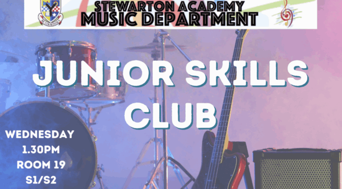 All S1 and S2 pupils are welcome to develop their classroom instrument skills (keyboard, tuned percussion, guitar, bass guitar and drum kit) at Junior Skills club.