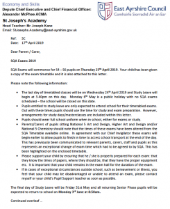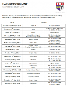Please find attached digital versions of information which has been issued to pupils regarding the upcoming SQA Exams 2019. Further copies are available from the school office.
