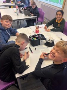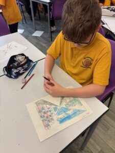 This week we drew cityscapes with 1-point of perspective disappearing towards a vanishing point to create sophisticated artworks with depth and interest. Great work P6/7!