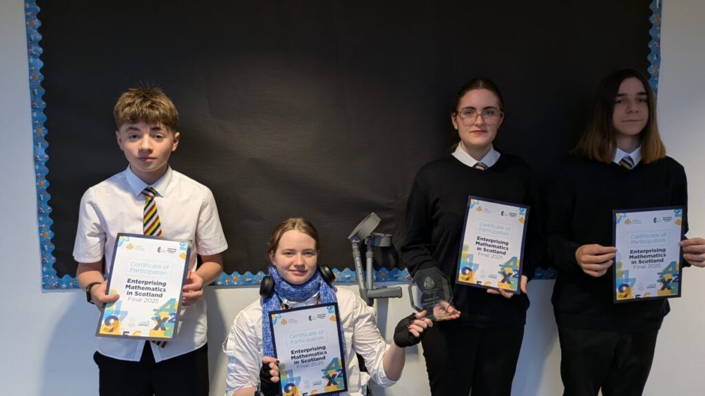On Tuesday Bogdan, Erin, Robyn and Abigail did a great job representing the school and, indeed, East Ayrshire at the Enterprising Maths National Final. They had fun exploring the science centre at lunchtime, even challenging Mr Craig to a game of 4-way air hockey!