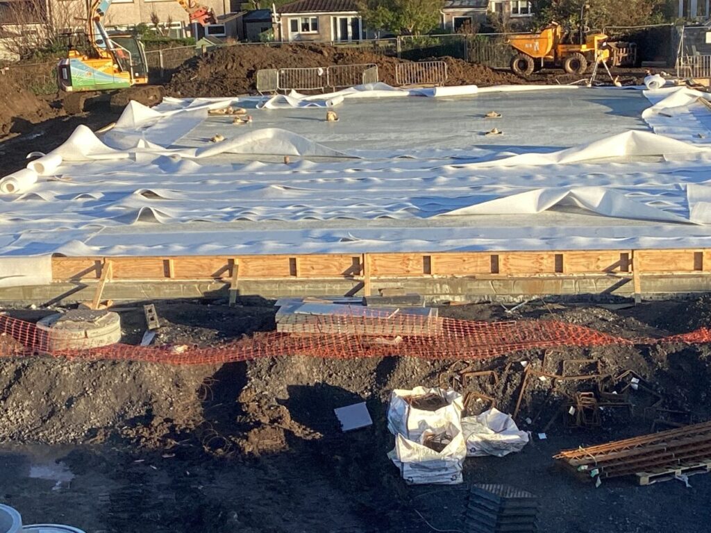 Now that the first foundations have set, they have been covered with sheets to protect them while the builders prepare for the next stage.