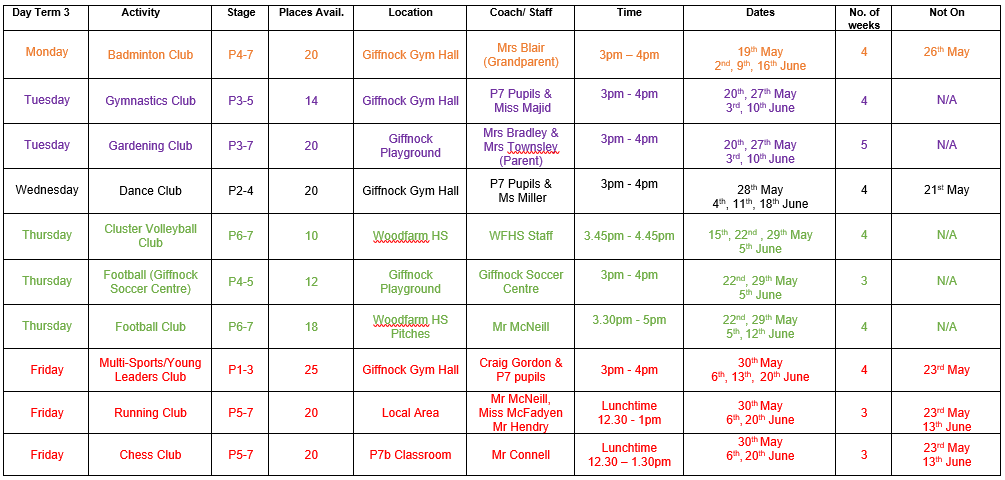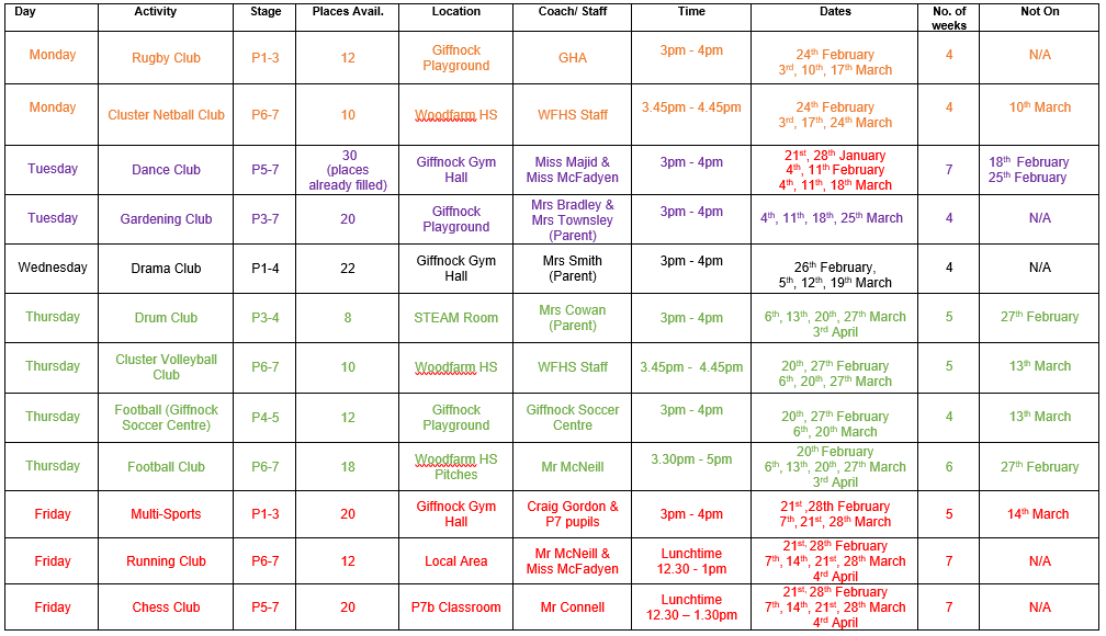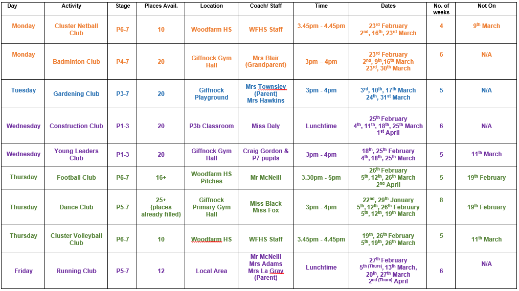 The school has a flourishing set of after-school clubs for P1-P7 thanks to the hard work of Giffnock staff, Active Schools partners and our parent leaders. Pupils can participate in a wide range of activities each term. Please join in and try something new!