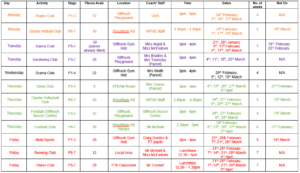 We are always keen to involve more parents in the after school clubs, so if you have a particular skill or hobby which you would like to share we would love to hear from you! Most clubs run for one hour, from 3-4pm. The clubs don’t have to be sporting – in the past we have had board games clubs, craft clubs, coding clubs, sewing clubs and drama clubs.