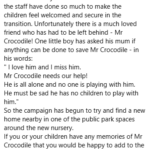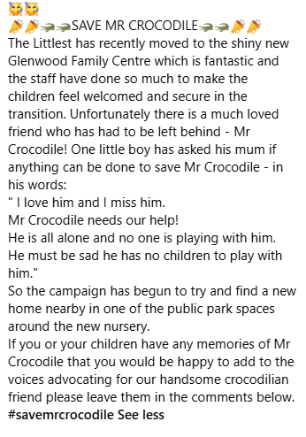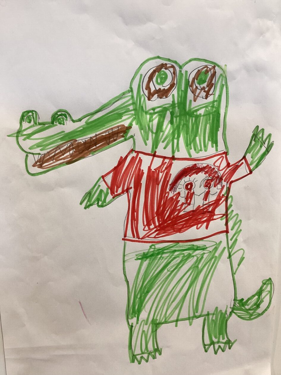 Just in case you don’t know, we have a large crocodile lurking in our wooded area of the garden. He was rescued from our old building after a public campaign led by one of our families so Mr Crocodile is perfect!