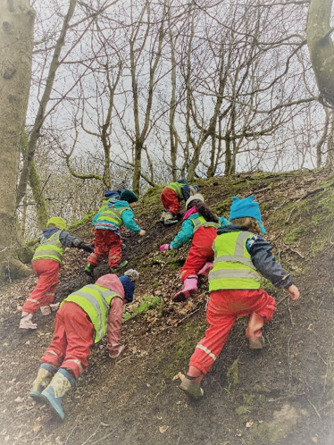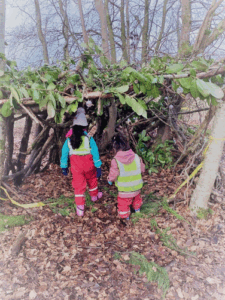 Children play an active role in shaping and enriching the woodland environment. They confidently share ideas and collaborate with adults to enhance the space, such as constructing tyre swings, building stick dens, climbing ladders, and creating cosy corners for quiet play. Beyond the Base Camp, children regularly venture further into the woodland on small ‘adventures’. Through these explorations, they have developed a strong sense of belonging by naming special places within the woods that are meaningful to them, including areas such as Bunny Land, Dragon’s Leg, The Slide, and Mount Everest.