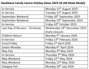 Please see below the most up-to-date information regarding holidays, in-service days and times when Hazeldene Family Centre will be closed. Please bear in mind that – depending on your child’s attendance pattern – you will either follow school term-time holidays or the 48 week model. Any questions, please do not hesitate to ask.