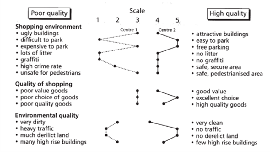 Centre 1 contrasts unfavourably for things such as graffiti, litter, poor parking, heavy traffic and derelict land. However, there is less difference between the quality of shopping at each.