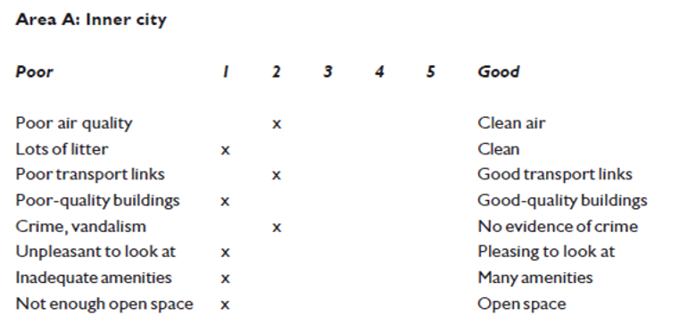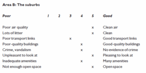 An environmental quality survey was undertaken in two contrasting mountain resorts. Resort B is in an area which has seen government investment in ski infrastructure and facilities. The results for each resort are shown below; a score of 1 in a row means that the area is bad, 5 means it is good.