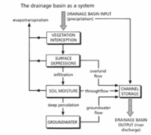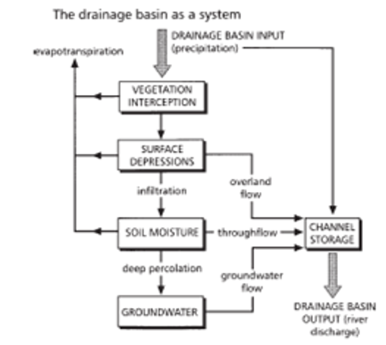 Starting at the top of the diagram and working down the page, we can see that the input into the drainage basin is precipitation. Most of the precipitation falls onto the vegetation and from there some of it is lost through evapotranspiration. Of the remainder, the water flows from the vegetation down into surface depressions where again some is lost through evapotranspiration and some becomes overland flow into channel storage.