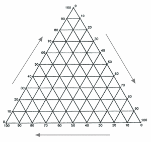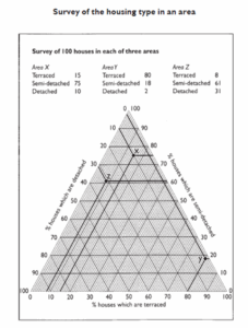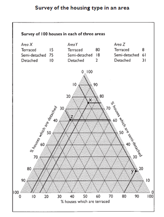 Triangular graphs are used to show data that can be divided into three parts. Just like a triangle, they have three sides! They are sometimes known as ternary plots.