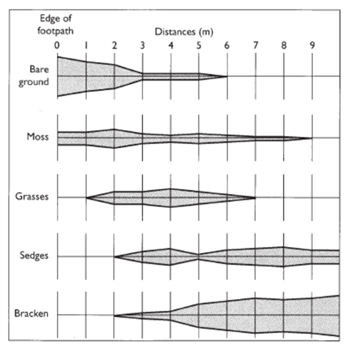 They are commonly used to show changes in the % cover of plant species/vegetation over slopes, sand dunes or away from a footpath.