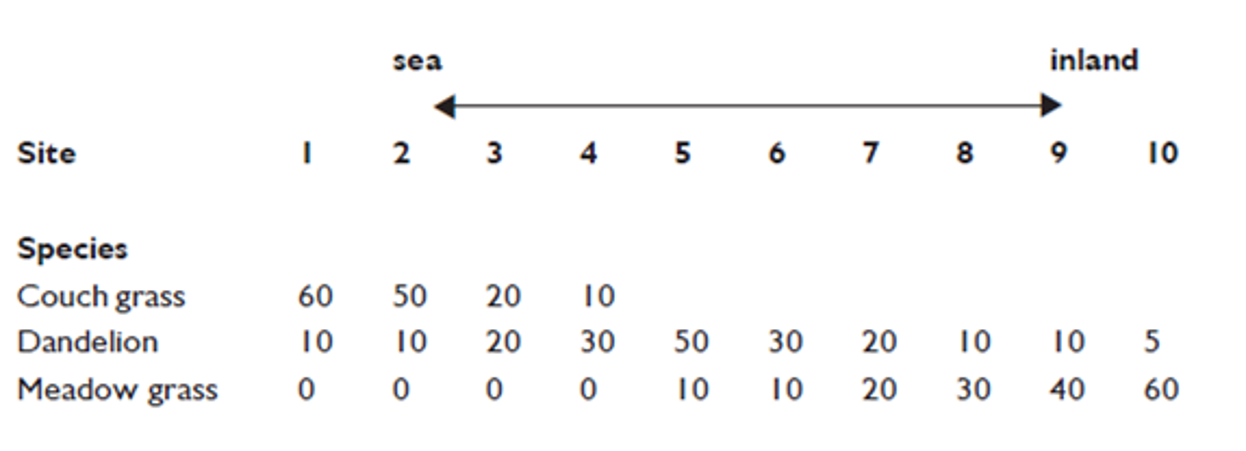 NatureScot is studying the presence of different species along a transect on a vulnerable dune system. The data is shown – plot this as a kite diagram.