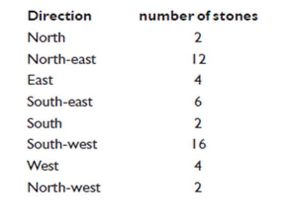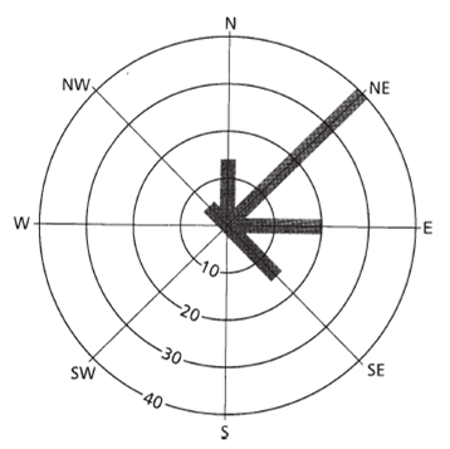 The data plotted on this polar graph shows that most corries in the Lake District face northwards and eastwards, and by reading off the scale (located between the south and south-west points) it can be seen that 40 corries face in a north-easterly direction, 20 in an easterly direction and 15 in a northerly direction.