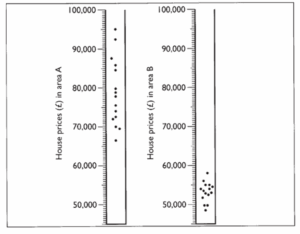 In this example, two dispersion diagrams are used to compare data. Area A and Area B are both suburbs of a town, but the close proximity of an airport to Area B is reflected in the house prices.