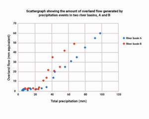 The above graph of total precipitation and overland flow would have a positive correction – as one gets bigger so does the other. River Basin A has a more strong correlation – we can be more certain here that precipitation does have an impact on overland flow.