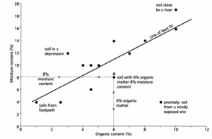 Plotting the data on a scatter graph allows gardeners to make a prediction of the organic content simply by knowing the moisture content. This is useful, as moisture content can be read with a simple meter in the field, whilst organic content involves burning off organic material in a lab environment.