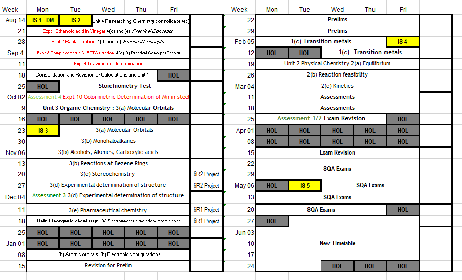 Timeline Below you will find the timelines for the Advanced Higher Chemistry course. Please note that these may change through the session. These give an indication of what will be taught during the year and dates of assessments.