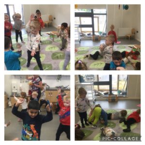 Next we decided to move like our favourite animals! We agreed that the giraffe is “very tall so we have to reach up to the sky, on our tippy toes”, “the hippo rolls in the mud, like this”, “the crocodile snaps like this”, and the cheetah runs really fast”.